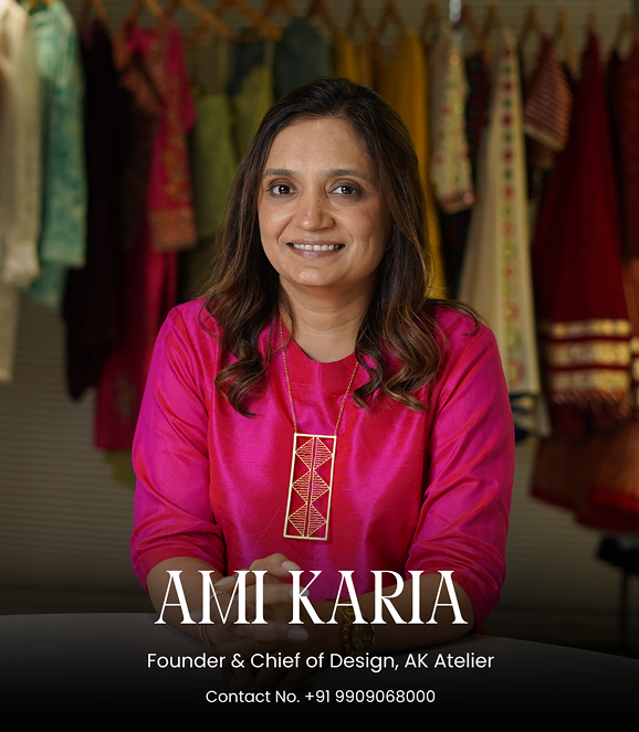 For over a decade, Ami Karia has been redefining Indian occasion wear through design that is both personal and timeless. She believes clothing should not only look beautiful – it should feel meaningful, carrying memory, comfort, and individuality in equal measure.