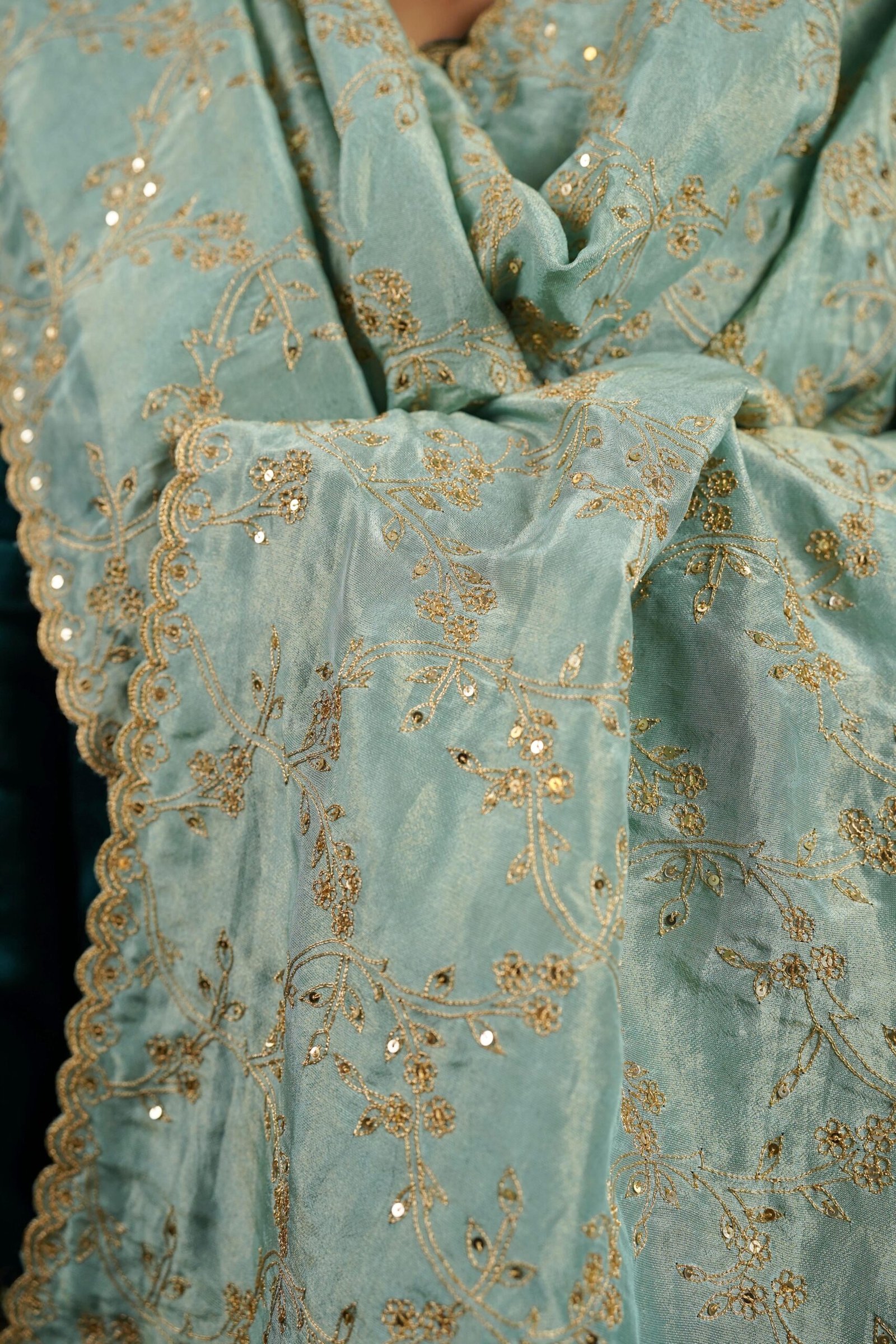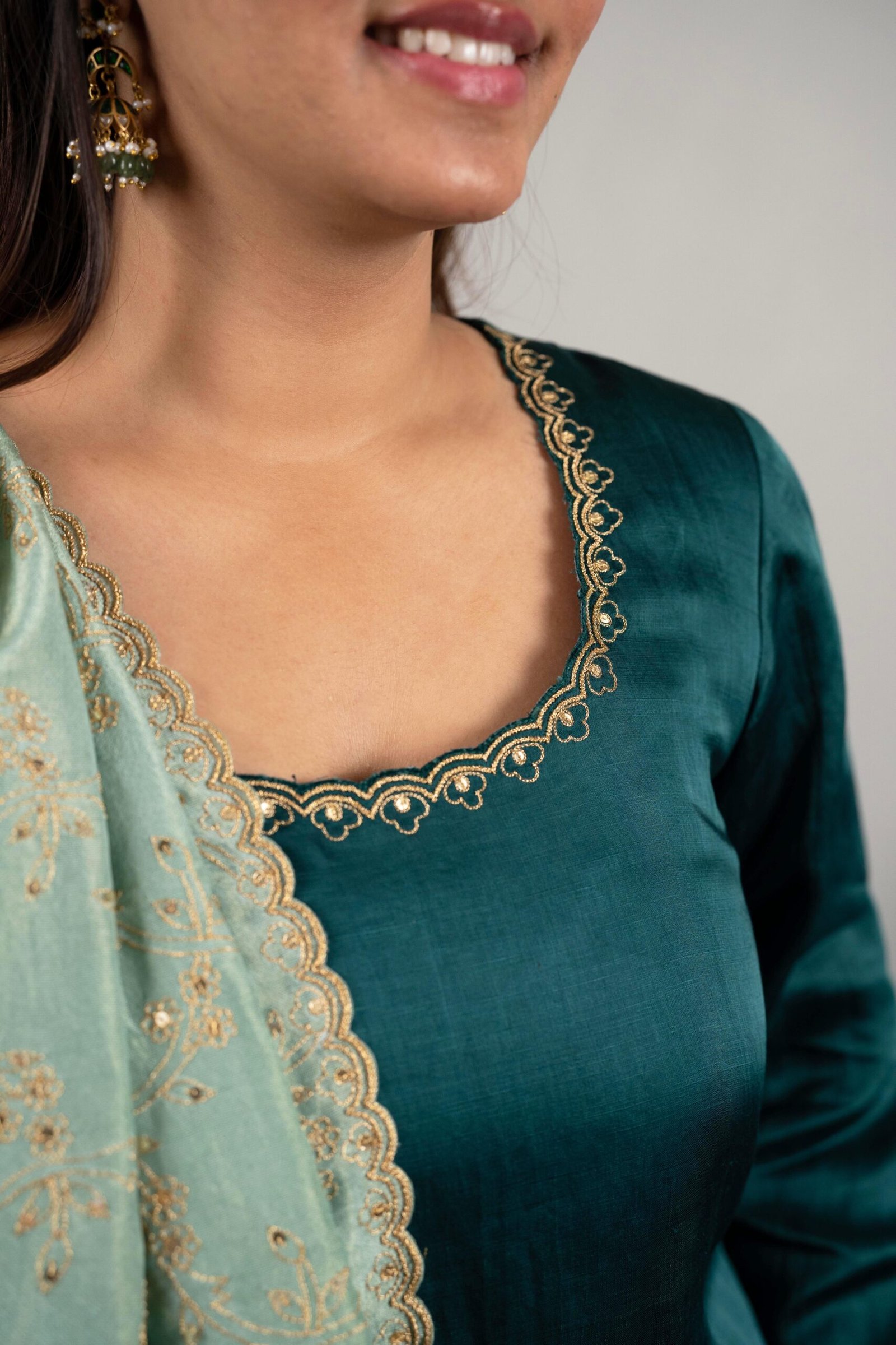 Swati Nakshatra, associated with movement, freedom, and gentle flow, guides this rich green Farshi salwar kurta set. The silk chanderi kurta falls fluidly over a voluminous farshi salwar, creating a silhouette that feels airy yet festive. Delicate dori and gold sequin embroidery decorate the kurta with subtle balance, allowing the fabric’s natural sheen to shine through. Finished with refined borders and thoughtful proportions, this ensemble is ideal for daytime weddings, festive gatherings, and traditional celebrations that call for comfort with grace.